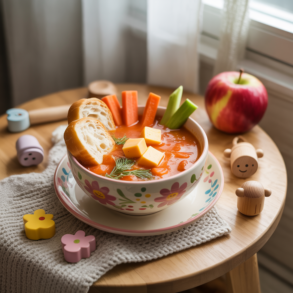 Sämige Brotsuppe mit mildem Gemüse und weichen Käsewürfeln – nährstoffreich, weich und perfekt ab 12 Monaten