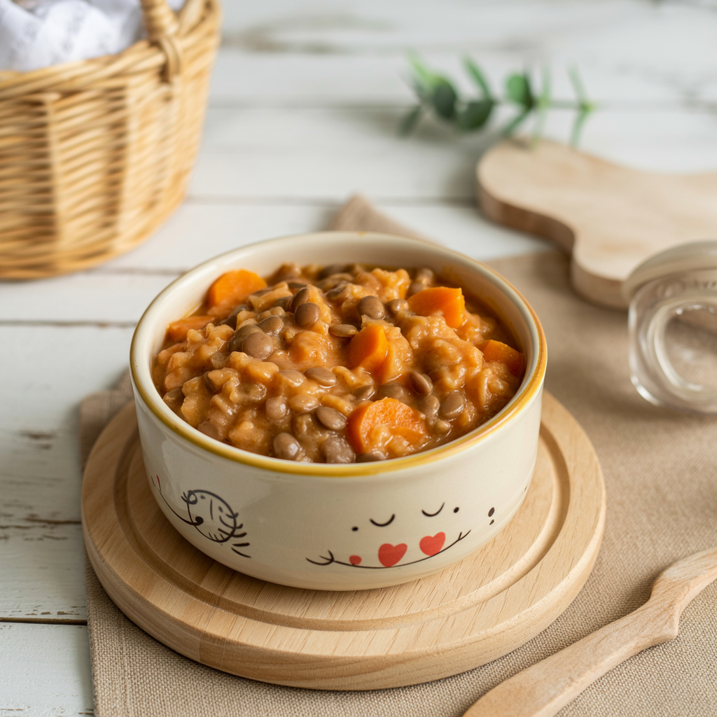 Dieses milde Gericht vereint nährstoffreiche Hülsenfrüchte mit weich gekochtem Gemüse und sättigender Kartoffel. Die Kombination aus Linsen, Karotten und Kartoffeln liefert Eisen, Ballaststoffe und komplexe Kohlenhydrate – perfekt für Babys ab 10 Monaten, die langsam an herzhafte Familienkost herangeführt werden. Die Konsistenz kann individuell angepasst werden – fein püriert oder leicht stückig – je nach Entwicklungsstand des Kindes.