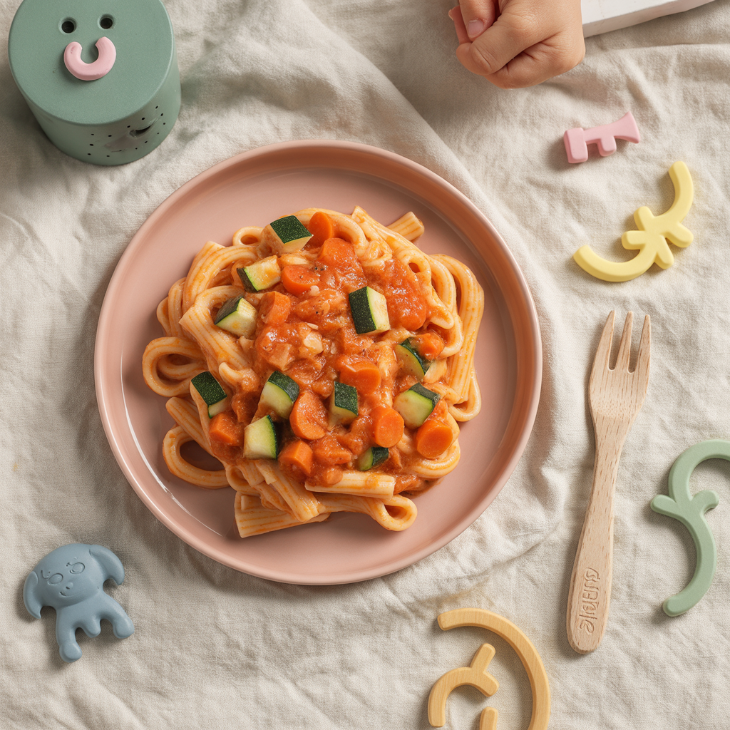 Weiche Nudeln mit milder Tomaten-Möhren-Soße und zarten Zucchiniwürfeln – ideal für die ersten Familientisch-Mahlzeiten ab 10 Monaten