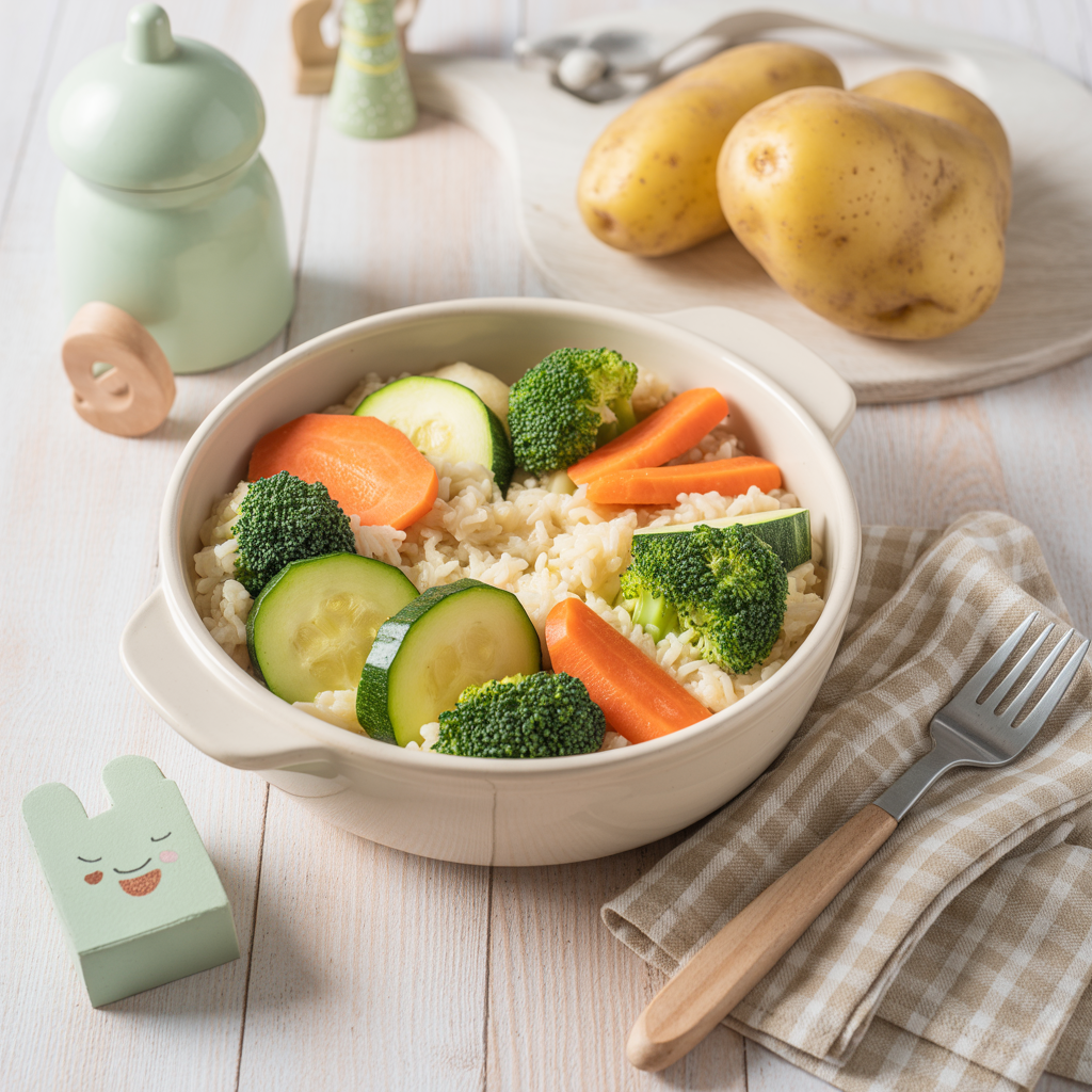 Dieses einfache Gericht kombiniert schonend gegartes Ofengemüse mit weich gekochtem Reis und ist damit eine tolle Wahl für kleine Kinder, die erste feste Mahlzeiten mit der Familie mitessen. Die Vielfalt an Gemüse sorgt für Abwechslung, Vitamine und Geschmack – und der Reis liefert sättigende Energie. Die milde Zubereitung ohne scharfe Gewürze macht das Gericht gut verträglich und anpassbar für jeden Entwicklungsstand: püriert, zerdrückt oder in Stückchen.