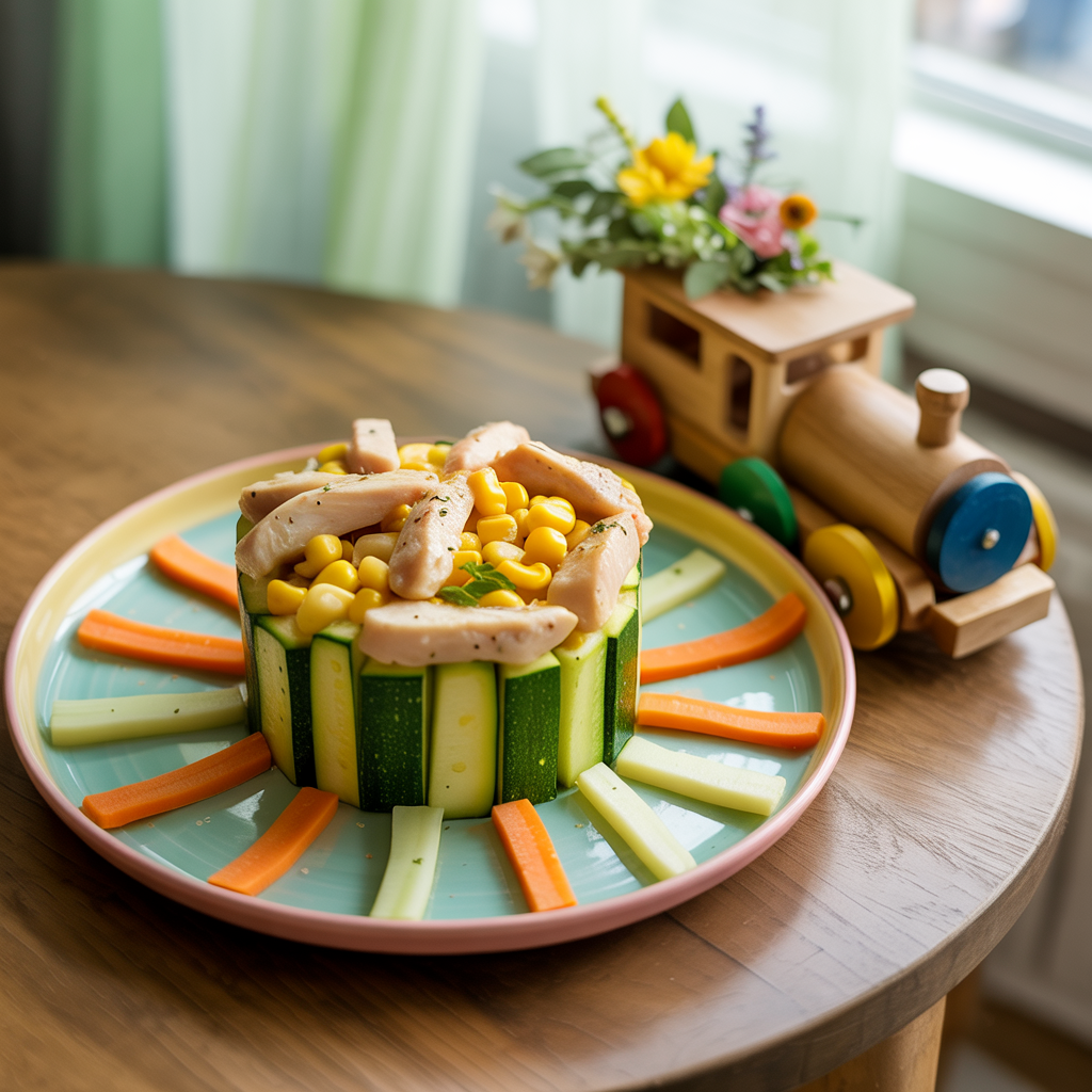 Diese bunte Gemüsepfanne vereint weiche Kartoffelwürfel mit mildem Mais, feiner Zucchini und zarten Hühnerstreifen. Die Kombination liefert eine ausgewogene Mahlzeit mit Eiweiß, Vitaminen, gesunden Fetten und langanhaltender Energie. Die Zutaten sind gut kaubar und sorgen für Abwechslung auf dem Familientisch. Perfekt für kleine Esser, die schon gerne mit der Gabel essen oder erste Stücke selbst greifen.